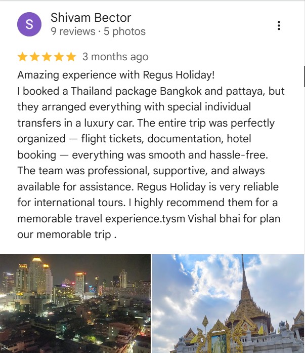 Regus holiday arrange my Thailand trip awesome. Thank you so much for all the facilities you provided a very good support during all the trip. Hotel and all the arrangements were very good. Family is very happy highly recommended.